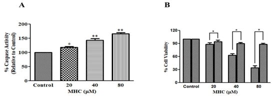 (A) Alteration in the levels of caspase-3 post treatment with MHC and (B) cell viability of MCF-7 cells treated with a caspase-3 inhibitor. * p < 0.05 and ** p < 0.01.