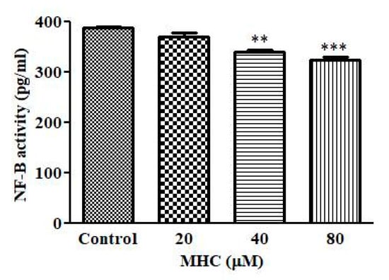 It is now an established fact that NF-κB is pivotal in the survival and proliferation of cancer cells. Therefore, the effect of MHC in regulating NF-κB levels was also assessed using a sandwich ELISA. The results as shown in Figure 8 indicated that no substantial effect on the NF-κB levels was seen at a 20 µM concentration; however, the level of NF-κB was significantly reduced at 40 µM (p < 0.01) and 80 µM (p < 0.001) concentrations of MHC.