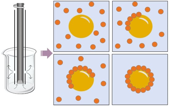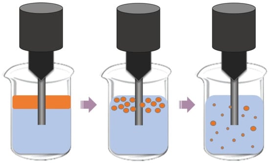 Another method for obtaining Pickering emulsions is by using an ultrasonic processor. This equipment uses the phenomenon of cavitation, which causes the breakdown of droplets, and which can be defined as the rapid formation and collapse of bubbles in a liquid []. The ultrasound energy is concentrated near the probe, causing cavitation, and it can prepare an emulsion with smaller emulsion droplets (Figure 4) [].
