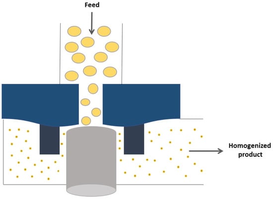 As a result, a pre-emulsion, which comprises a dispersion phase with large droplets, is forced through a high-shear region to promote turbulence and, therefore, aims to break down/disintegrate large droplets to generate a smaller particle size, as this equipment includes high-pressure pumps and homogeneous nozzles (Figure 3) [].