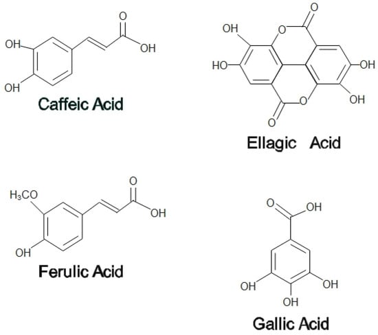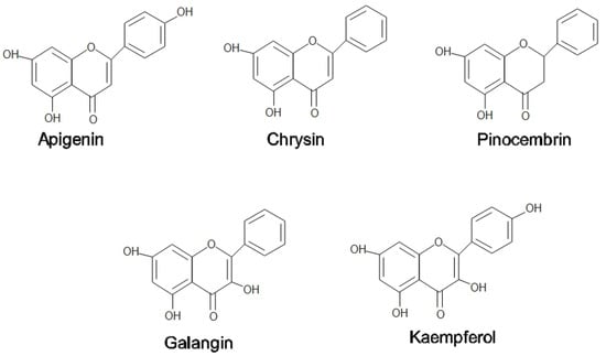 On the other hand, propolis is used by honeybees as a medium to patch any cracks or fragments found in the hive to help prevent the predator’s attack. Propolis functions as a thermal insulator to maintain the interior temperature of beehives at 35 °C. In addition, propolis hardens the cell wall, contributing to the aseptic conditions in the hives [3]. Propolis is a balsamic and resinous compound secreted by bees that are made up of a mixture of 50% plant resins, 30% waxes, 10% essential and aromatic oils, 5% pollen, and 5% other organic components [4]. Among the flavonoids found in propolis are pinocembrin, acacetin, chrysin, rutin, luteolin, kaempferol, apigenin, myricetin, catechin, naringenin, galangin, and quercetin; two phenolic acids, caffeic acid and cinnamic acid; and one stilbene derivative called resveratrol has been found in propolis extracts [5]. Propolis is also enriched with essential vitamins such as B1, B2, B6, C, and E and beneficial minerals such as magnesium, calcium, potassium, sodium, copper, zinc, manganese, and iron [6]. Phenolic compounds that contribute to a wide range of health-promoting benefits can be found practically in all propolis forms, irrespective of their geographical origin and season [5]. Figure 1 and Figure 2 show some flavonoids and phenolic acids found in honey and propolis.