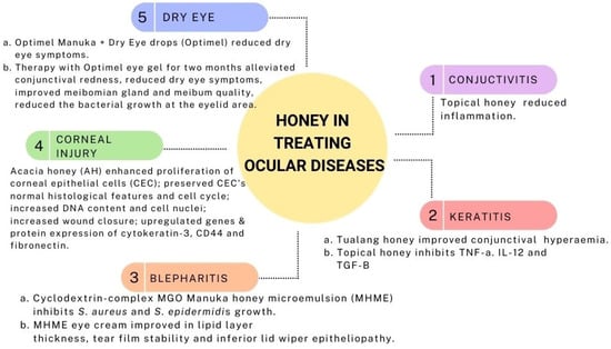 By considering the existing treatment modalities for eye diseases, the administration of honey is mainly targeted for its topical use. Therefore, studies involving honey in eye diseases have been focusing more on eye drops and ointment [57]. Among the eye diseases that have been incorporated with the beneficial honey application are typically conditions affecting structures of the ocular surface, mainly the conjunctiva, cornea, and eyelid.