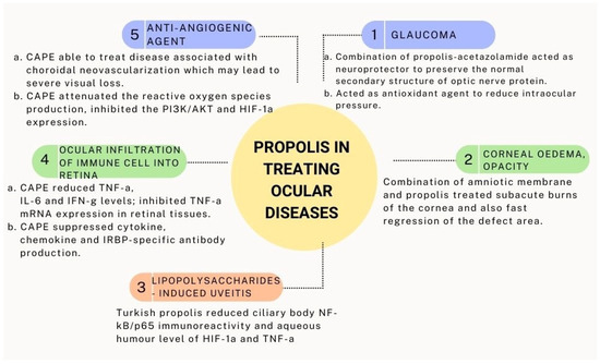 CAPE was also found to be a novel anti-angiogenic agent in vitro, suggesting that it could be used to treat diseases associated with choroidal neovascularization, which may lead to severe visual loss. The hypoxia-induced production of VEGF in the human retinal pigment epithelial cells (ARPE-1) was reduced after pre-treatment with CAPE. This effect was inhibited through the attenuation of reactive oxygen species production and the inhibition of phosphoinositide 3-kinase (PI3K)/AKT as well as hypoxia-inducible factor-1α (HIF-1α) expression [180]. Figure 4 summarizes the medicinal values of propolis in treating ocular disease.