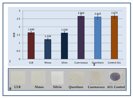 (I) Representation of antibody levels in the serum of rabbits immunized with the protein extract of T. cruzi isolates. Results are expressed as mean ± IC of the optical density (OD) at 520 nm measured in ELISA: (II) evaluation of ALL antigen vs. anti-T. cruzi polyclonal serum of five strains by dot blot.