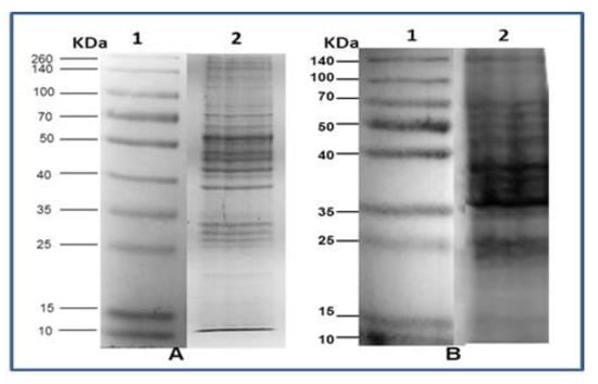 The recognition by Western blotting of the ALL and NB antigens (total extract) shows different specific bands for each isolate. Figure 2 shows the electrophoretic patterns of cell extract ALL and NB, respectively; both were run by 12% SDS PAGE under the same running conditions.