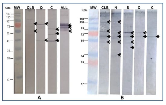Western blot analysis using as antigen: (A) ALL cell lysate and (B) NB cell lysate vs. immunized serum against different isolates of T. cruzi (heterologous). MW.—protein molecular weight marker. CLB.—anti-CLB serum. N.—anti-Ninoa serum. S.—anti-Silvio serum. Q.—anti-Querétaro serum. C.—anti-Cuernavaca serum. ALL.—control anti-ALL serum. Arrows indicate the most significant bands that are shared between the different strains of T. cruzi with ALL and NB.