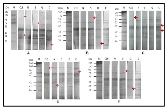 Western blot analysis: cell lysates of each strain of T. cruzi were electrophoresed by 12% SDS-PAGE and transferred onto nitrocellulose membrane, and then treated with antibodies against T. cruzi strains (Homologous). (A) CLB vs. CLBrenner (CLB), Ninoa (N), Silvio (S), Querétaro (Q), and Cuernavaca (C); (B) Ninoa vs. CLB, N, S, Q, and C; (C) Silvio vs. CLB, N, S, Q, and C; (D) Queretaro vs. CLB, N, S, Q, and C; (E) Cuernavaca vs. CLB, N, S, Q, and C. Arrows indicate differences observed between strains.