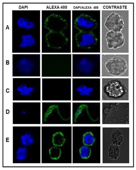 Sub15 ALL cells were cultured in RPMI 1640 medium (supplemented with 10% FBS and 1× antibiotic/antimycotic) and NB cells in DMEM medium. The axenic culture of T. cruzi was used as a positive control. Cells were harvested and washed with PBS. A total of 50,000 viable cells were fixed with 2% paraformaldehyde for 15 min. After 40 min of washing with PBS, it was blocked with 2% pig serum in PBS for 1 h and the permeabilized slides were incubated with 2% pig serum and 0.5% Triton in PBS for 20 min. They were incubated for 1 h with T. cruzi antibodies 1:300 with 2% pig serum in PBS. IgG purified from unimmunized New Zealand rabbit serum was used as a negative control. Reactivity was carried out with specific anti-rabbit IgG antibodies conjugated to Alexa-Fluor 488 (Invitrogen cat no. A-11034) diluted 1:300 with 2% pig serum in PBS for 1 h. Cell nuclei were stained with 20 µg/mL of 4,’6-diamidino-2-phenylindole dilactate (DAPI) (Invitrogen cat no. D1306). The images were taken with a Leica model TCS-5P8X confocal microscope, with a 63× immersion lens, 5× digital zoom, and analyzed with the LasX software.