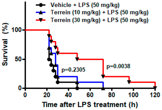 To investigate the effect of terrein on sepsis in vivo, we examined the effect of terrein on the LPS-induced endotoxemia. As shown in Figure 2, the administration of a high dose of LPS (50 mg/kg) resulted in 100% mortality within 48 h and the median survival time of the vehicle-treated group was 23 h. However, treatment with 10 mg/kg or 30 mg/kg of terrein increased the median survival time to 28 h (p = 0.2305) and 60 h (p = 0.0038), respectively (Figure 2).