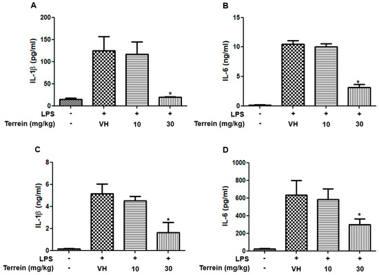 To investigate whether the protective effect of terrein on LPS-induced endotoxemia is mediated by inhibiting inflammatory responses, we analyzed the serum levels of inflammatory cytokines, including IL-1β and IL-6. Figure 3A,B show that the serum levels of IL-1β and IL-6 were dramatically increased by LPS treatment. However, treatment with 30 mg/kg of terrein significantly suppressed the levels of inflammatory cytokines induced by LPS treatment (Figure 3A,B). In addition, we also examined the levels of IL-1β and IL-6 in lung tissue. As shown in Figure 3C,D, LPS treatment substantially increased the levels of IL-1β and IL-6 in the lungs and this was inhibited significantly by terrein (30 mg/kg) treatment.