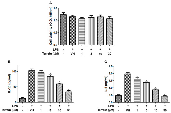 To further confirm the anti-inflammatory effect of terrein, we investigated the effect of terrein on the production of inflammatory cytokines in a mouse macrophage cell line, RAW 264.7. Figure 4A shows that terrein had no significant cytotoxic effect in LPS-stimulated RAW 264.7 cells at the concentrations used in this study. The treatment of RAW 264.7 cells with LPS (200 ng/mL) markedly induced the production of IL-1β and IL-6 (Figure 4B,C). However, terrein suppressed the LPS-induced production of IL-1β and IL-6 in a concentration-dependent manner and treatment with 30 μM of terrein resulted in 67% and 78% inhibition of IL-1β and IL-6 production, respectively, in LPS-stimulated RAW 264.7 cells (Figure 4B,C).