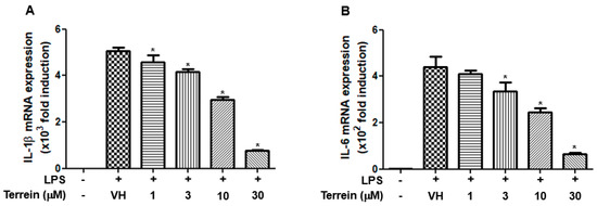 To further investigate whether the inhibitory effect of terrein on the production of IL-1β and IL-6 was due to the inhibitory effect of terrein on the mRNA expression of cognate genes, we examined the effect of terrein on LPS-induced mRNA expression of IL-1β and IL-6 in RAW 264.7 cells using quantitative RT-PCR. As shown in Figure 5A,B, LPS substantially increased the mRNA expression of IL-1β and IL-6. However, this induction was inhibited by terrein treatment in a dose-dependent manner (Figure 5A,B).