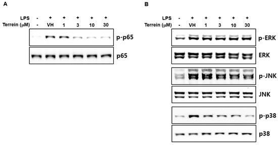 To further investigate the molecular mechanisms responsible for the inhibitory effect of terrein on the gene expression of IL-1β and IL-6, we first evaluated the effect of terrein on LPS-induced phosphorylation of p65 subunit of NF-κB at S536 residue of transactivation domain, which leads to enhanced transactivation of NF-κB. As shown in Figure 6A, terrein dose-dependently inhibited the phosphorylation of the p65 subunit in LPS-stimulated RAW 264.7 cells. We also examined the effect of terrein on the phosphorylation of ERK, JNK, and p38 MAPK in LPS-stimulated RAW 264.7 cells. Figure 6B shows that treatment with terrein suppressed the LPS-induced phosphorylation of JNK and p38 MAPK, but not that of ERK, in RAW 264.7 cells.