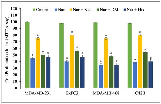 Several studies show that naringin suppresses cell proliferation, migration, and invasion and enhances apoptosis in a variety of cancer cells, including those of bladder, hepatocellular, breast, colorectal, and gastric malignancies []. Copper appears to play a critical role in the cytotoxicity of naringin [,] based on the existing research. To confirm the critical role of intracellular copper in the cytotoxic action of naringin, multiple cancer cell lines were treated with specific metal chelators, and it was discovered that only the copper chelator, Neo, was able to protect MDA-MB-231, BxPC-3, MDA-MB-468, and C42B cells against the growth-inhibiting action of naringin (Figure 2). DM and His (iron and zinc chelators, respectively) had a protective effect against naringin-induced growth suppression. However, this was still less than Neo’s level of inhibition.