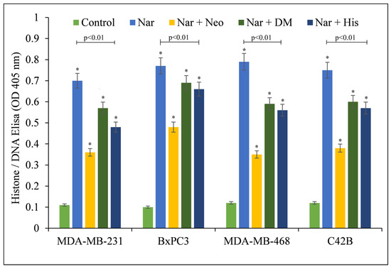 Effects of various metal chelators on naringin-induced apoptosis in four distinct cancer cell lines. MDA-MB-231, BxPC3, MDA-MB-468, and C42B cancer cells were treated with 100 µM naringin either alone or in the presence of the copper chelator neocuproine (Neo), the iron chelator desferrioxamine mesylate (DM), or the zinc chelator histidine (His), as shown in the figure. The metal chelator concentration utilized was 50 µM. As mentioned in the Materials and Methods section, ELISA was conducted 72 h following treatment. Values reported are ±S.E.M. of three independent experiments. * p-value < 0.05 when compared to respective control.