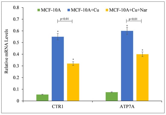 The effect of naringin on the elevated mRNA transcript levels of copper transporters CTR1 and ATP7A in MCF-10A-Cu cells compared to MCF-10A cells. Total RNA was extracted utilizing TRIzol reagent (Invitrogen, Carlsbad, CA, USA) per manufacturer’s instructions. CTR1 and ATP7A mRNA expression was quantified using real-time PCR, as stated in the Materials and Methods section. To determine the effect of naringin on mRNA expression, only MCF-10A-Cu (normal MCF-10A cells grown in a medium containing 25 µM CuCl2) was treated with 100 µM naringin. Values reported are ±S.E.M. of three independent experiments. * p-value < 0.05 when compared to untreated control.