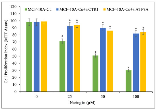 Cell proliferation of MCF-10A-Cu cells (normal MCF-10A cells cultured in a medium containing 25 µM CuCl2) was significantly reduced after treatment with naringin following CTR1 and ATP7A knock-down. MCF-10A-Cu cells were first treated with naringin or with specific si-RNA against CTR1 (siCTR1) and ATP7A (siATP7A) for 48 h and then with indicated concentrations of naringin for 24 h. Values reported are ±S.E.M. of three independent experiments. * p-value < 0.05 when compared to respective control.