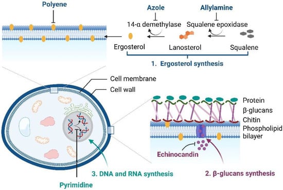 Mechanisms of the actions of antifungal drugs (created with Biorender.com).