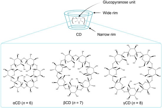 CDs are obtained from the enzyme-catalyzed starch degradation by glucosyltransferase enzymes []. Their molecular structures resemble a torus-like molecular ring in which the inner cavity is hydrophobic and the outer one is hydrophilic. The hydroxyl functional groups are orientated to the outer cavity, whereas the interior cavity is lined with skeletal carbons and the ethereal oxygens of the glucose residues, representing its lipophilic character (Figure 2). The primary hydroxyl groups are located at the narrow rim of the torus, whereas the secondary hydroxyl groups are positioned at the wide rim of the CD structure. CDs have the ability to enhance the aqueous solubility of various poorly water-soluble drugs by inserting the lipophilic moiety of the drugs into their central hydrophobic cavity []. The parent CDs, α-cyclodextrin (αCD), β-cyclodextrin (βCD), and γ-cyclodextrin (γCD), possess six, seven, and eight glucopyranose units, respectively. In the CD molecules, it is possible to form intramolecular hydrogen bonds between the C2-OH of one glucopyranose unit and the C3-OH of an adjacent glucopyranose unit. Particularly in βCD, a complete secondary belt formation exists that leads to its molecular rigidity, thereby reducing the ability of βCD to form hydrogen bonds with surrounding water molecules. For this reason, βCD has the lowest water solubility among the parent CDs. In contrast, one glucopyranose unit of αCD is in a distorted orientation with an incomplete hydrogen bond belt and enhanced solubility compared to βCD. γCD possesses a noncoplanar with a more flexible structure and, thus, is more soluble in water than both αCD and βCD [,]. Random substitution at the hydroxy groups located on the outer surface of the CD molecule dramatically improves the solubility of CDs (Table 1).