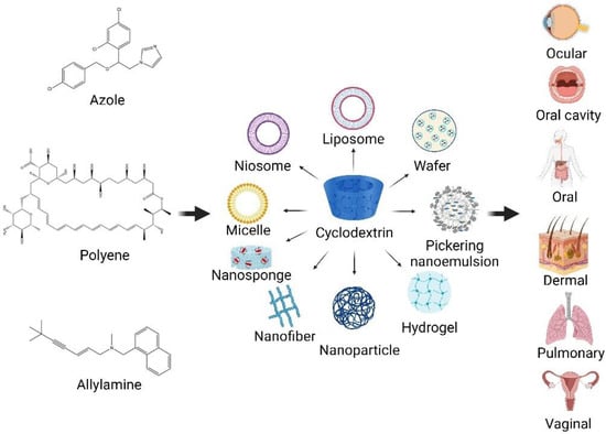 Presently, nanotechnology offers an ingenious solution for overcoming the drawbacks of poorly water-soluble drugs in formulation development. The use of several CD-based nanocarriers in formulations has been reported for drug delivery systems (Figure 3). The combined technology has also been of interest as an effective system for antifungal drug delivery. The use of biocompatible and biodegradable components, as well as versatility, stability, high drug loading, and permeability through biological membranes, are obvious benefits of using these carrier systems for the effective delivery of antifungal agents.