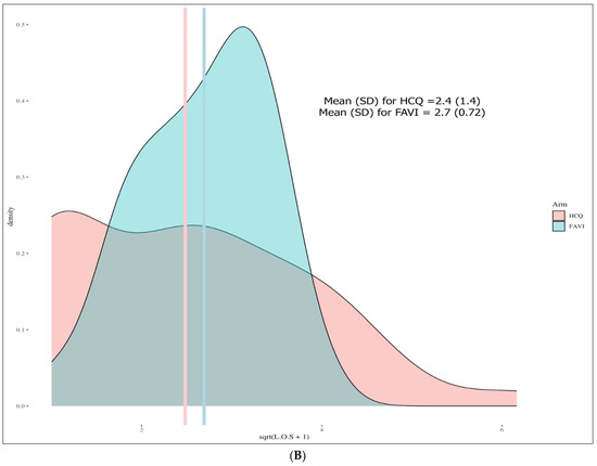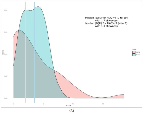 The LOS distribution was positively skewed with a tail to the right (skewness of 1.7 in the HCQ group and 1.1 for the FPV group). The result of the Shapiro–Wilk test was a significant p-value < 0.001, as was the Levene’s test, (p-value = 0.019), indicating an unequal variance. In the matched sample, the LOS median (IQR) for the HCQ was four days (0 to 10), and seven days (4 to 9) for the FPV, with no statistical difference, based on the Wilcoxon signed-rank test between the two groups (−0.75; 95% confidence interval (CI), −4.0 to 2.5, p-value = 0.629). A visual representation of these findings is shown in Figure 1A.