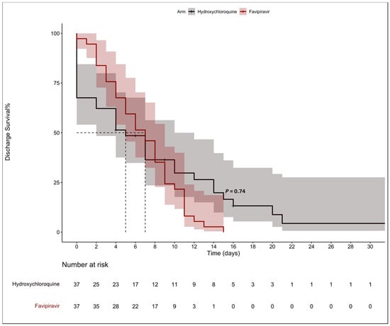 The Kaplan–Meier model showed that the median time to discharge was five days (95% CI, 2 to 10) for the HCQ group and seven days for the FPV group (95% CI, 5 to 10), with no statistical significance between the two groups (p-value = 0.740), as shown in Figure 2. Two deaths occurred in the HCQ group and no deaths occurred in the FPV group, p-value = 0.493 (Table 2). None of the patients included in this study required mechanical ventilation during their hospital stay.