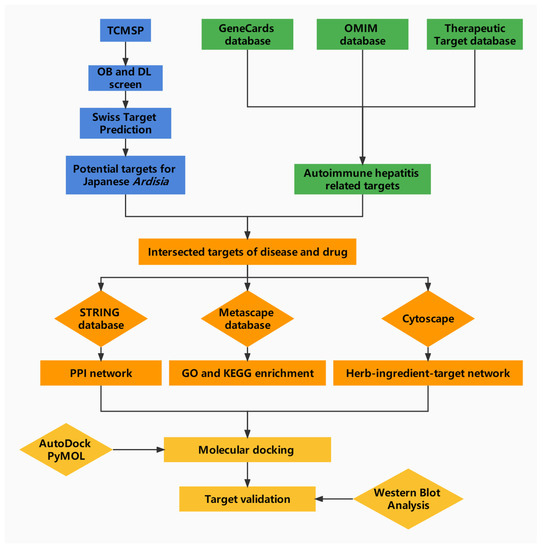 Cyberpharmacology can effectively reveal the material basis and mechanism of action of Chinese medicine by systematically and integrally exploring the relationship between drugs and diseases [18]. Thus, the aim of this study is to systematically elucidate the mechanism of Japanese Ardisia in the treatment of AIH through network pharmacology and molecular docking analysis of the interaction between drug molecules and AIH-related targets, and to provide a theoretical basis for clinical research. The specific flow chart is shown in Figure 1.
