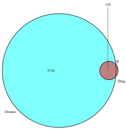 The information on the main bioactive components and corresponding targets in Japanese Ardisia were obtained from the TCMSP database (TCMSP, https://lsp.nwu.edu.cn/tcmsp.php, accessed on 14 November 2021). After screening to remove invalid gene IDs, the targets downloaded from the GeneCards (http://www.genecards.org, accessed on 14 November 2021), OMIM databases (OMIM, http://www.omim.org, accessed on 14 November 2021), and TTD (http://db.idrblab, accessed on 14 November 2021) were crossed with those from the TCMSP database to obtain potential targets for the treatment of AIH in Japanese Ardisia. The obtained data are presented as a Venn diagram (Figure 2). There were 5724 autoimmune hepatitis gene targets, of which 153 were potential targets related to the drug Japanese Ardisia. The drug-related genes and disease-specific targets were analyzed, and 143 key target genes were identified. The targets of the active ingredients of Japanese Ardisia are shown in Table 2.