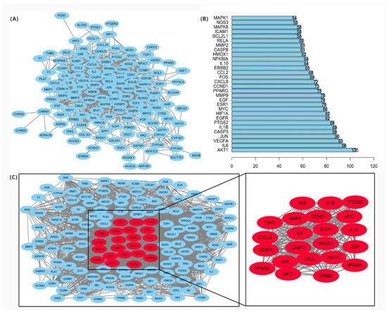 The common targets of Japanese Ardisia and autoimmune hepatitis were imported into the STRING protein interaction database (https://string-db.org, accessed on 15 November 2021) to construct the PPI network (Figure 3A). The top 30 target proteins analyzed by R software (https://www.r-project.org/ accessed on 15 November 2021) are shown in Figure 3B. The intersections of differential genes between Japanese Ardisia active ingredient targets and autoimmune hepatitis disease targets were imported into Cytoscape 3.7.0 (http://www.cytoscape.org, accessed on 15 November 2021) for topological analysis. The key targets were sorted according to the degree value, with higher degree values indicating nodes that were more central in the network and more important. Through the PPI protein interaction network, the disease-related targets are found, and the degree value is greater than the median by screening twice to find key targets. Thus, the key target genes for autoimmune hepatitis treatment mainly included AKT1, IL6, VEGFA, CASP3, JUN, MYC, etc. (Figure 3C).