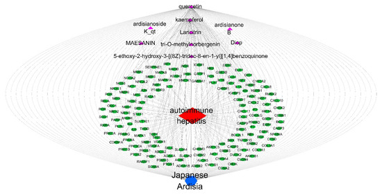 Network diagram of “Japanese Ardisia-component-gene-autoimmune hepatitis”. Note: Japanese Ardisia is blue; components are purple; the gene is green; and autoimmune hepatitis is red.