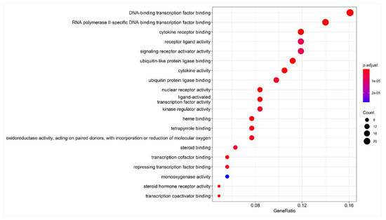 The 20 GO nodes with the greatest number of annotated proteins were selected for display. These nodes mainly involved DNA–binding transcription factor binding, RNA polymerase II-specific DNA binding, cytokine receptor binding, receptor-ligand activity, ubiquitin-like protein ligase binding, cytokine activity, ubiquitin–protein ligase binding, nuclear receptor activity, ligand-activated transcription factor activity, and kinase regulatory activity. The p-values were arranged from largest to smallest, and visual analysis was performed using an advanced bubble graph (Figure 5). DNA–binding transcription factor binding had the most obvious effect, and the greatest number of genes, followed by RNA polymerase II-specific DNA binding, cytokine receptor binding, receptor-ligand activity, ubiquitin-like protein ligase binding, cytokine activity, and ubiquitin–protein ligase binding. Meanwhile, nuclear receptor activity, ligand-activated transcription factor activity, kinase regulator activity, and other pathways indirectly affected a series of signaling pathways, eventually causing changes in biological processes.