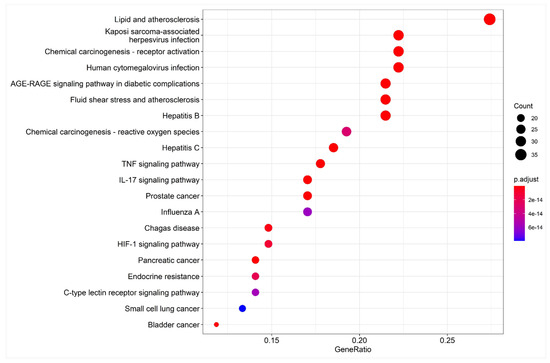 One hundred and sixty-three pathways were identified in the KEGG enrichment analysis. The top 20 signaling pathways mainly involved the lipid and atherosclerosis pathway, Kaposi sarcoma-associated pathway, human cytomegalovirus infection pathway, IL-17 signaling pathway, TNF signaling pathway, hepatitis B pathway, and the AGE-RAGE signaling pathway were involved in diabetic complications (Figure 6). The results suggest that Japanese Ardisia can be used to treat autoimmune hepatitis through multi-target and multi-pathway regulation.