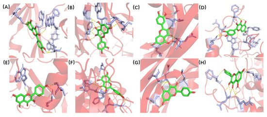 Molecular docking of quercetin and kaempferol with AKT1, IL6, VEGFA and CASP3. (A) Quercetin and AKT1. (B) Quercetin and IL6. (C) Quercetin and VEGFA. (D) Quercetin and CASP3. (E) Kaempferol and AKT1. (F) Kaempferol and IL6. (G) Kaempferol and VEGFA. (H) Kaempferol and CASP3.