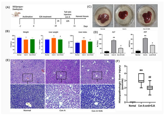 (A) Description of the rat model of acute immune liver injury used in this study. (B) Body weight, liver weight, and liver coefficient changes in rats 10 days after EJA treatment. Compared with normal group, ** p < 0.01, * p < 0.05; Compared with model group, # p < 0.05. Note: EJA is an extract of Japanese Ardisia. Data were shown as mean ± SEM (n = 6 per group). (C) Rat liver treated with EJA. (D) Effect of EJA on serum ALT and AST levels. Compared with normal group, ** p < 0.01; Compared with model group, # p < 0.05. Note: EJA: an extract of Japanese Ardisia. Data were shown as mean ± SEM (n = 3 per group). (E) Histopathological sections of rat liver (HE staining, 200× 400×). (F) Effect of Japanese Ardisia pretreatment on the scoring of liver pathological sections of rats with con A-induced liver injury. Compared with normal group, ** p < 0.01; compared with model group, ## p < 0.01. Note: EJA is an extract of Japanese Ardisia. Data were shown as mean ± SEM (n = 6 per group). Scoring criteria: 0—no necrosis; 1—individual cell necrosis; 2—less than 30% necrosis; 3—30–60% necrosis; 4—greater than 60% necrosis [22].