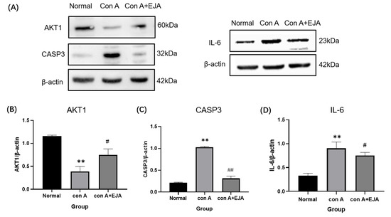 Western blot analyses. (A) Western blot analysis of AKT1, CASP3, and IL-6. (B–D) Relative expression of CASP3, AKT1, and IL-6 in the liver tissue of SD rats. Compared with normal group, ** p < 0.01; Compared with model group, ## p < 0.05, # p < 0.05. Data were shown as mean ± SEM (n = 3 per group). Note: EJA is an extract of Japanese Ardisia.