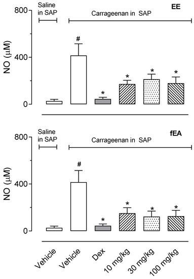 2.5. T. granulosa EE and fEA Reduced the Production of Nitric Oxide in SAP