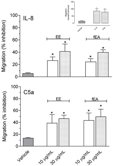 2.6. T. granulosa EE and fEA Decreased Polymorphonuclear Neutrophils (PMNs) Migration Induced by IL-8 and C5a