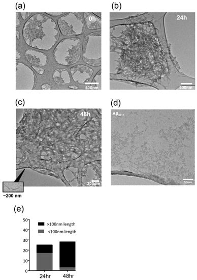 Temporal profile of Aβ1-42 fibrillization. Transmission electron microscopy (TEM) was used to monitor Aβ1-42 fibrillization. Representative images (from n = 22) using a NH4OH dissolution protocol (see Methods) showed that (a) at 0 h, the peptide was largely not aggregated, (b) at 24 h, peptide fibrillization had started (protofibrils <100 nm) and (c) by 48 h, the peptide aggregated into larger protofibrils (>100 nm in length); (d) as a comparison, Aβ42-1 was analysed, revealing that it did not aggregate into protofibrils and it remained as unaggregated clumps. (e) Image J analysis of protofibril length revealed that by 48 h, the majority of the protofibrils were over 100 nm in length, and at 24 h with the NH4OH protocol the predominant form was <100 nm (n = 22–28).