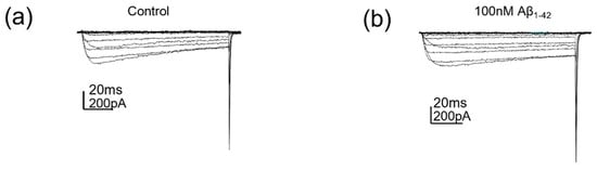 The 100 nM protofibrillar Aβ1-42 did not affect Cav2.2 currents. (a) Cav2.2 currents evoked by voltage steps (−70 to +50 mV) following control (PBS) treatment and (b) Cav2.2 currents evoked by voltage steps (−70 to +50 mV) following 100 nM protofibrillar Aβ1-42 treatment.