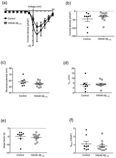 Effect of protofibrillar 100 nM Aβ1-42 on Cav2.2 kinetics. Whole-cell patch clamp popul-tion experiments investigating the effect of protofibrillar 100 nM Aβ1-42 vs. vehicle control (PBS) on Cav2.2 channel kinetics of Cav2.2 stably transfected HEK293 cells; mean ± SEM, n = 8–11 throughout. (a) Current density–voltage (−70 to +50 mV) relationship; (b) current density of Cav2.2 channels at +10 mV; (c) reversal potential of Cav2.2 current; (d) half-activation voltage of Cav2.2 channels; (e) changes in the slope factor (k) of Cav2.2 current; and (f) maximal conductance of Cav2.2 channels.