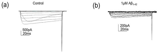 1 µM protofibrillar Aβ1-42 reduced Cav2.2 currents. (a) Cav2.2 currents evoked by voltage steps (−70 to +50 mV) following control (PBS) treatment and (b) Cav2.2 currents evoked by voltage steps (−70 to +50 mV) following 1 µM protofibrillar Aβ1-42 treatment.