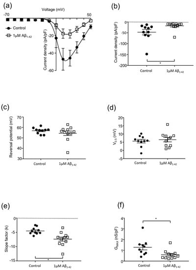 - Plant, L.D.; Webster, N.J.; Boyle, J.P.; Ramsden, M.; Freir, D.B.; Peers, C.; Pearson, H.A. Amyloid β Peptide as a Physiological Modulator of Neuronal ‘A’-Type K+ Current. Neurobiol. Aging 2006, 27, 1673–1683. [Google Scholar] [CrossRef]