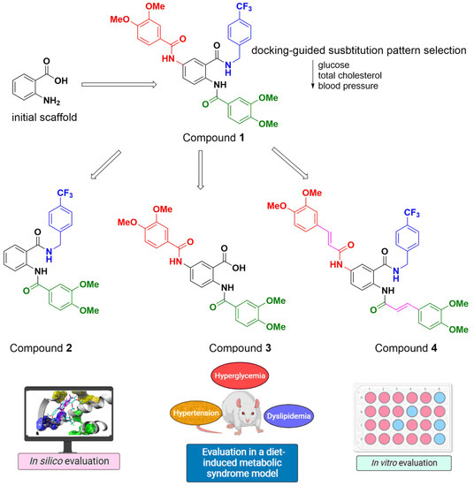 To identify the structural factors related to the effect of substituted 5-aminoanthranilic acid derivatives over the parameters of MetS, we decided to modify the structure of compound 1, as depicted in Figure 2. These modifications included the simplification of the structure of compound 1 to render compounds 2 and 3, which could improve the physicochemical properties associated with the ADME profile since these compounds would not violate any of Lipinski’s rules; in addition, their bioevaluation would clarify the most relevant structural factors related to their multitarget properties. Additionally, we proposed compound 4 since it has been reported that incorporating ferulic acid-like moieties improves antioxidant and cardioprotective activities, and ferulic acid itself exhibited positive effects in a MetS rodent model [50,51,52,53]. In this work, we present the synthesis, in silico evaluation, and determination of the influence of the administration of these compounds in the in vivo diet-induced MetS model.
