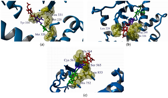 Predicted poses of compound 3 in the active site or ligand-binding domain (LBD) of the analyzed targets. (a) PPAR-α; (b) PPAR-γ; (c) HMG-CoA reductase. Key residues for ligand binding are labeled. The color code for compound 3 is the same as in Figure 2.