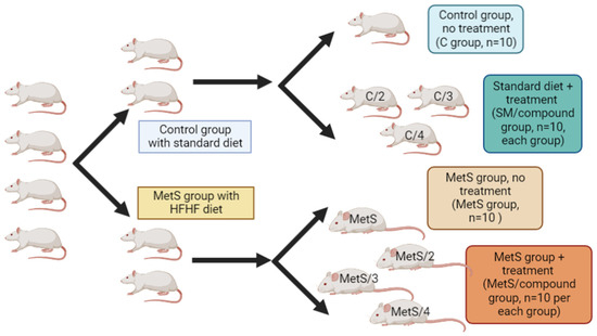 In the diet-induced model, MetS was generated through 12 weeks of the consumption of a high-fructose high-fat (HFHF) diet per the previous experience in our group [38,46]. The control group received a standard diet during the same period. After this induction phase, the animals of the standard diet were randomly allocated into two groups; one group (C/treated groups) would receive treatment with compounds 2, 3, or 4 for 14 days (10 mg/kg, p.o.), and the other group would receive no treatment (C groups). The same allocation was made for the diet-induced MetS group (the MetS group received no treatment, while MetS/treated groups received compound 2, 3, or 4, 10 mg/kg, p.o. for 14 days), as depicted in Figure 4.