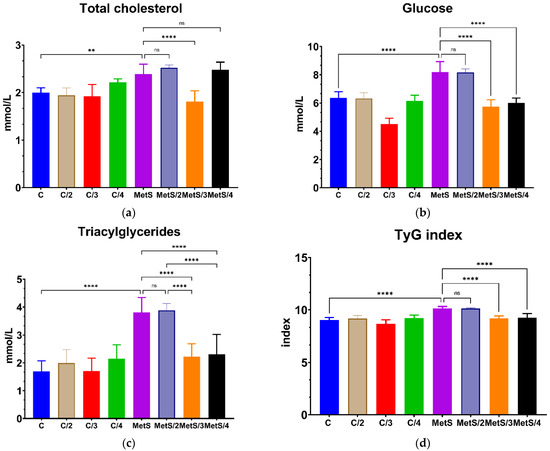 The effect after 14 days of administration of compounds 2, 3 and 4 on metabolic parameters associated with MetS on the in vivo model. (a) Total cholesterol, (b) Glucose, (c) Triacylglycerides, (d) TyG index. Data are shown as means ± standard deviation (SD). The number of stars represents the level of significance differences between MetS groups and their MetS/treated groups; ns: not statistically significant difference (p > 0.05); ** p < 0.001; **** p < 0.0001.