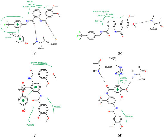 Comparison of the predicted complexes of compound 1 with (a) PPAR-α and (b) PPAR-γ; complexes of compound 3 with (c) PPAR-α and (d) PPAR-γ. Diagrams generated using the ProteinPlus portal [62].
