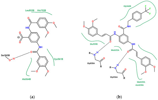 Comparison of the predicted complexes of (a) compound 3 and (b) compound 4 with HMG-CoA reductase. Diagrams generated using the ProteinPlus portal [62].