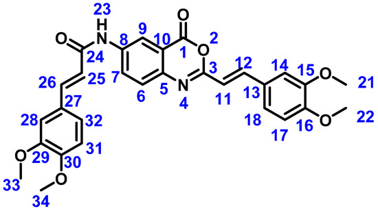(E)-3-(3,4-dimethoxyphenyl)-N-(2-((E)-3,4-dimethoxystyryl)-4-oxo-4H-benzo[d][1,3]oxazin-6-yl)acrylamide (5c). IR (ATR, cm−1): 3343 (N-H), 2889 (C=C), 1759 (C=O), 1684 (C=O, amide), 1586 (C=C, aromatic), 1134 (O-CH3). 1H NMR (DMSO-d6, 500 MHz) δ: 10.55 (1H, s, H23), 8.56 (1H, d, J = 2.4 Hz, H9), 7.99 (1H, dd, J = 2.4, 8.8 Hz, H7), 7.62 (1H, d, J = 16.0 Hz, H12), 7.54 (1H, d, J = 8.8 Hz, H6), 7.54 (1H, d, J = 15.5 Hz, H26), 7.40 (1H, d, J = 1.7 Hz, H14), 7.27 (1H, dd, J = 1.7, 8.4 Hz, H18), 7.19 (1H, d, J = 1.7 Hz, H28), 7.17 (1H, dd, J = 1.7, 8.4 Hz, H32), 6.98 (1H, d, J = 8.4 Hz, H31), 6.95 (1H, d, J = 8.4 Hz, H17), 6.87 (1H, d, J = 16.0 Hz, H11), 6.65 (1H, d, J = 15.5 Hz, H25), 3.80 (3H, s, H21), 3.79 (3H, s, H33), 3.76 (6H, s, H22, H34). 13C {1H} NMR (DMSO-d6, 125 MHz) δ: 164.72 (C24), 159.49 (C1), 156.50 (C3), 151.33 (C16), 151.10 (C30), 149.55 (C15), 149.43 (C29), 142,28 (C5), 141.67 (C26), 141.10 (C12), 139.59 (C8), 128.04 (C7, C13), 127.84 (C6), 127.76 (C27), 123.28 (C18), 122.57 (C32), 119.67 (C25), 117.57 (C10), 117.23 (C11), 116.87 (C9), 112.22 (C31), 112.08 (C17), 110.69 (C14), 110.51 (C28), 56.13 (33), 56.07 (34), 55.92 (21), 55.45(22). See Figure 8 for atom numbering. MS (FAB, m/z): 515 (M+ + 1, 100%). Elemental analysis: experimental C, 66.17%: H, 5.18%; N, 5.12%; calculated C, 67.70%; H, 5.09%; N, 5.44%.