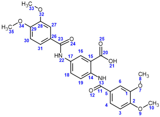 Method A: In a round-bottom flask, 1.3225 g of 3,4-dimethoxybenzoyl chloride (6.592 mmol) was added to 10 mL of pyridine at room temperature. Next, 0.5 g of 2,5-diaminobenzoic acid (3.2882 mmol) was added to the solution, obtaining a beige -colored suspension. The reaction mixture was stirred for 24 h at room temperature. Afterward, once the reaction was completed, the crude was transferred to a beaker with 20 mL of water and was treated with chloride acid until it reached pH 2, rendering a white precipitate that was filtered and dried under reduced pressure to render the desired product as a white solid in a 35% yield. Method B: Given the low yield obtained from the previous synthesis route for compound 3, an alternative synthesis route was proposed from the basic hydrolysis of the benzoxazinone ring of compound 5a, prepared as previously reported [38]. In a round-bottom flask with 3 mL of DMF, 0.2 g of compound 5a was added, obtaining a milky white suspension. Next, 10 mL of a 5% NaOH solution was slowly added, giving place to a white suspension. The reaction mixture was stirred for 2 h at room temperature, followed by the treatment of the crude with diluted HCl solution until it reached pH 2. The acid treatment of the crude resulted in the formation of a white precipitate that was filtered and dried under reduced pressure to give the desired product as a white solid in an 85% yield. m.p 289–292 °C; IR (ATR, cm−1): 3377 (N-H); 3125.14 (C-H sp2), 2932.72 (C-H sp3), 1654.05 (C=O amide), 1601.18 (C=C aromatic), 1189.74 (C-O); 1H NMR (DMSO-d6, 500 MHz) δ: 12.23 (1H, s, H13), 10.18 (1H, s, H22), 8.62 (1H, d, J = 8.8 Hz, H19), 8.45 (1H, d, J = 2.5 Hz, H16), 7.94 (1H, dd, J = 8.8, 2.5 Hz, H18), 7.58 (1H, dd, J = 8.5, 1.8 Hz, H4), 7.51 (1H, d, J = 1.8 Hz, H6) 7.50 (1H, dd, J = 8.5, 1.8 Hz, H31), 7.45 (1H, d, J = 1.8 Hz, H27), 7.05 (1H, d, J = 8.5 Hz, H3), 7.01 (1H, d, J = 8.5 Hz, H30), 3.80 (6H, s, H10, H35), 3.79 (3H, s, H8), 3.76 (3H, s, H32). 13C{1H} NMR (DMSO-d6, 125 MHz) δ: 170.60 C20), 165.49 (C23), 164.59 (C11), 152.39 (C2), 152.14 (C29), 149.10 (C1), 148.73 (C28), 137.60 (C14), 134.38 (C17), 127.29 (C5), 127.04 (C26), 126.57 (C18), 123.59 (C16), 121.62 (C4), 120.69 (C31), 120.30 (C19), 117.53 (C15), 111.70 (C3), 111.31 (C6, C30), 110.63 (C27), 56.18 (C10), 56.12 (C35), 56.09 (C8), 55.95 (C32). See Figure 9 for atom numbering. MS (FAB, m/z): 481 (M+ + 1, 100%). Elemental analysis: experimental C, 61.18%: H, 5.12%; N, 5.47%; calculated C, 62.50%; H, 5.04%; N, 5.83%.